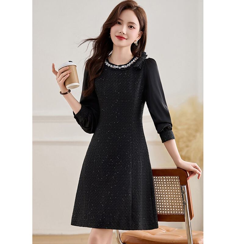ワンピース 2色展開 ツイード スパンコール Aライン ベージュ ブラック M L XL 2XL