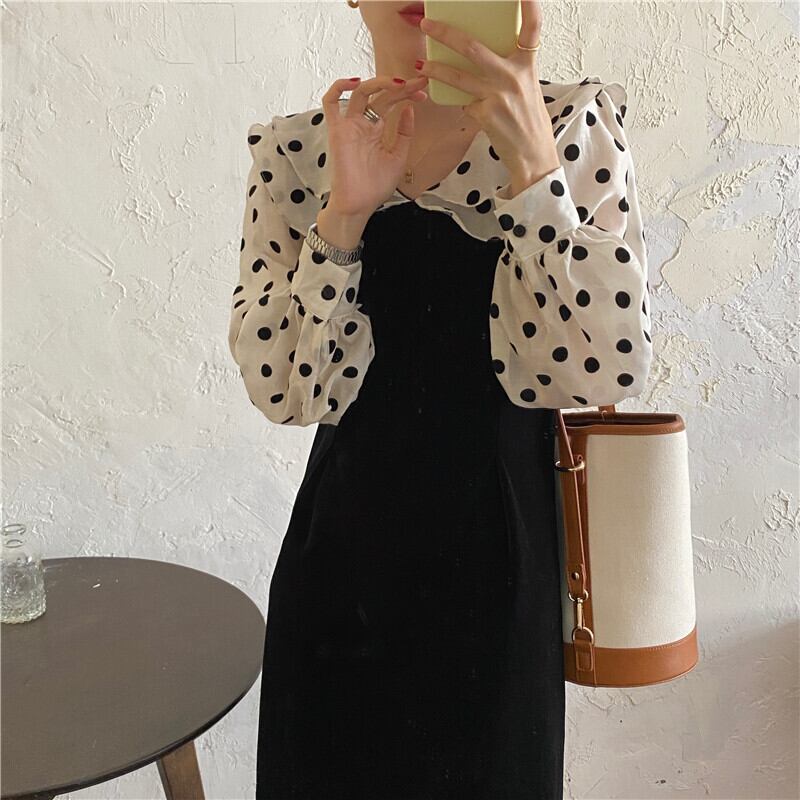 ワンピース ドット柄 カジュアル 水玉模様 気質溢れる 長袖 ブラック S M L