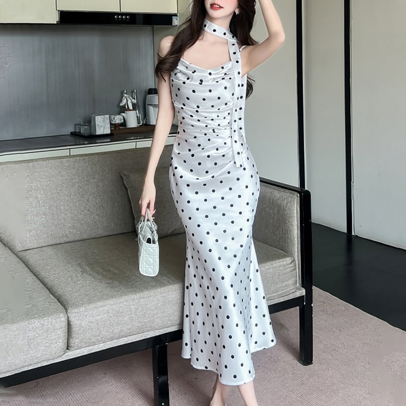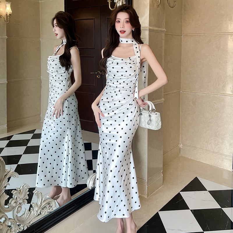 【CHERRYシリーズ】ワンピース ドット柄 フェミニン 細見え効果抜群 ホワイト S M L XL