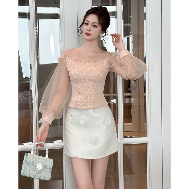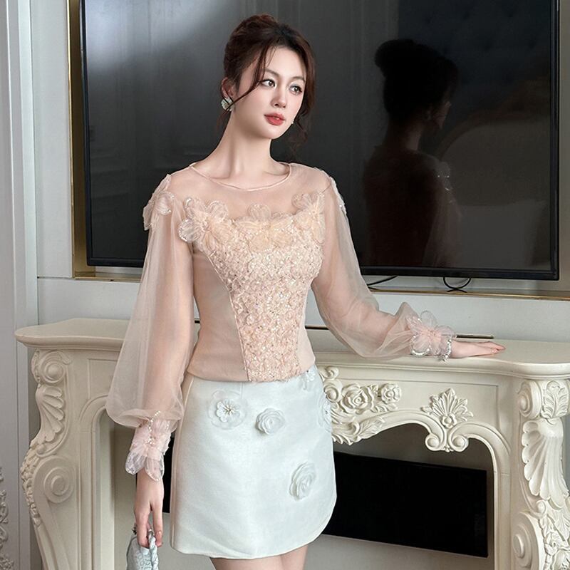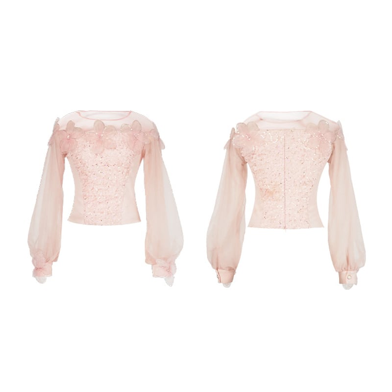 【夕暮薔薇シリーズ】トップス ブラウス パフスリーブ 長袖 レース 大きいサイズ S M L XL 2XL