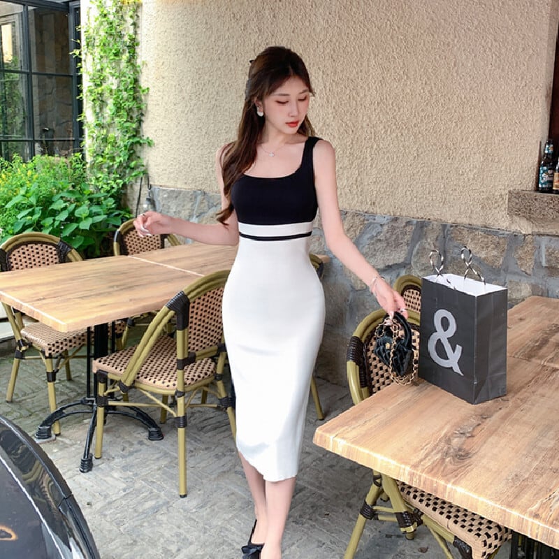 ワンピース スクエアネック ニット 黒白配色 スリムフィット S M L