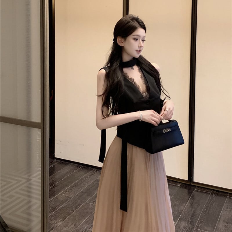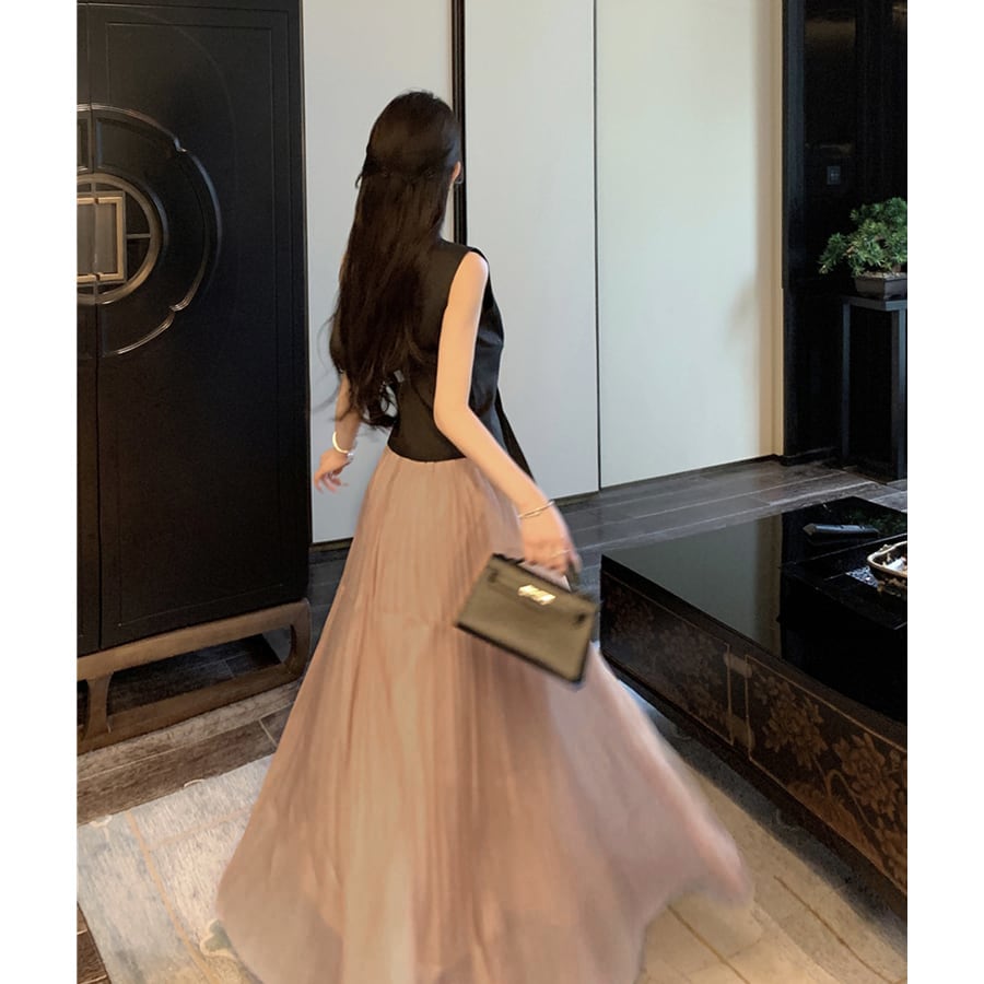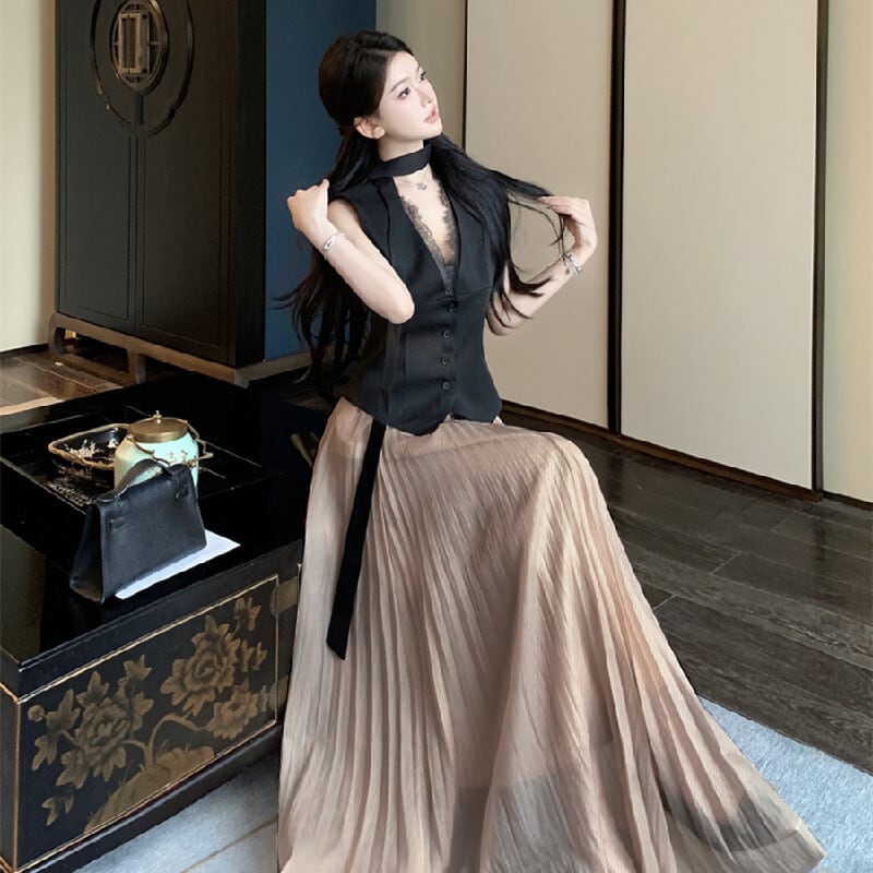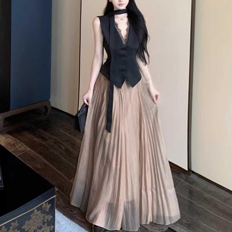 セットアップ トップス+スカート Vネック ノンスリーブ ハイウエスト プリーツ S M L