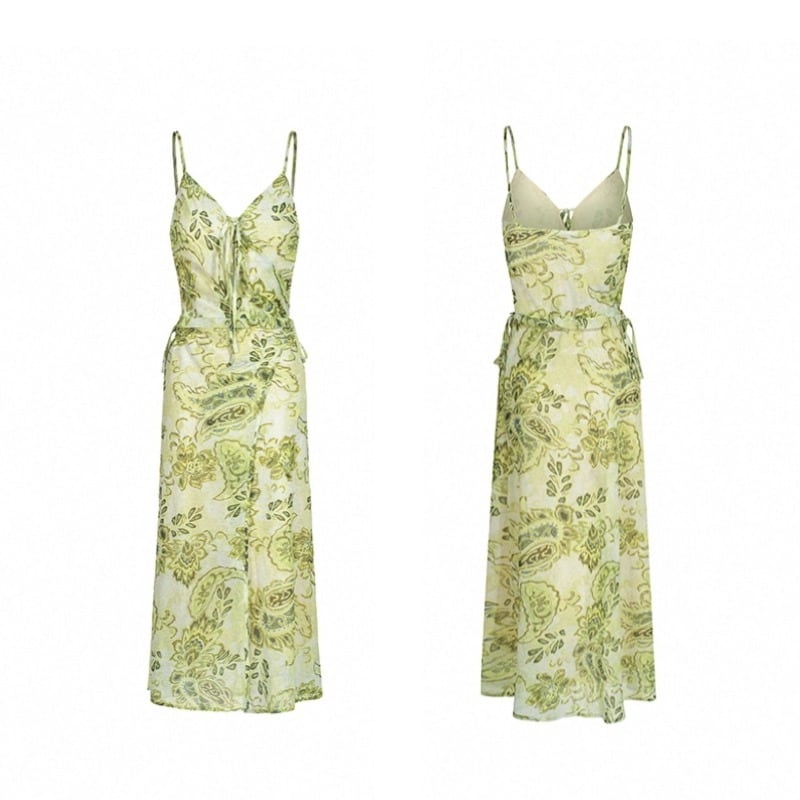 ロングワンピース プリント 一目惚れ スリット 気質溢れる グリーン S M L
