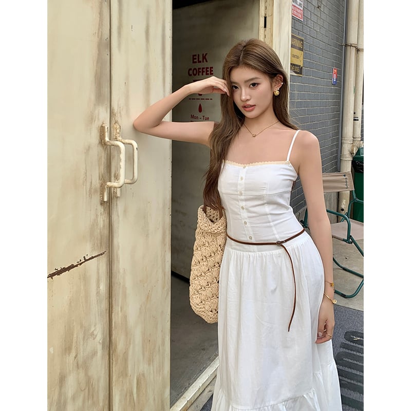 ロングワンピース 無地 カジュアル ハイウエスト ティアードドレス ホワイト S M L