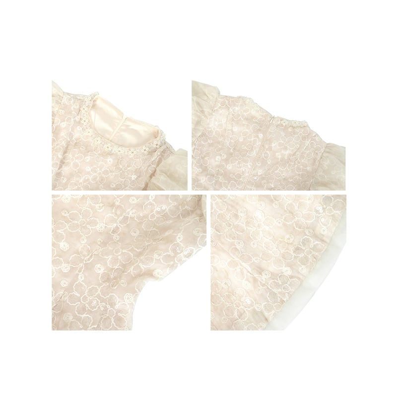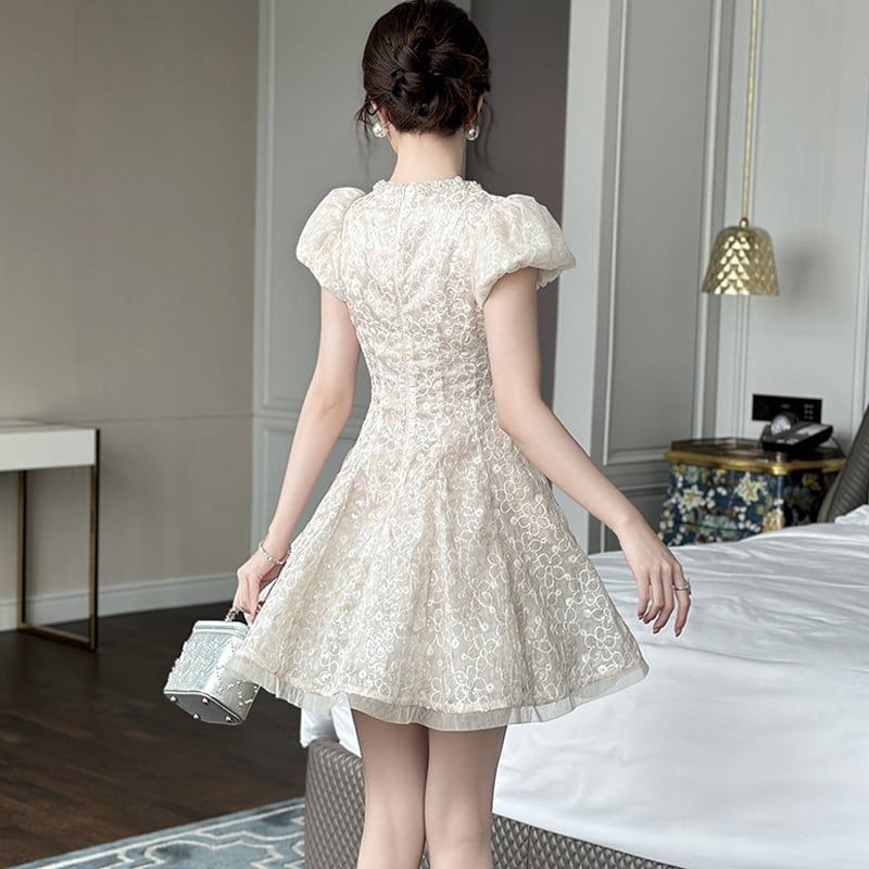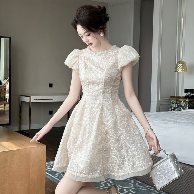 【夕暮薔薇シリーズ】ワンピース パフスリーブ Aライン 大きいサイズ ベージュ S M L XL 2XL