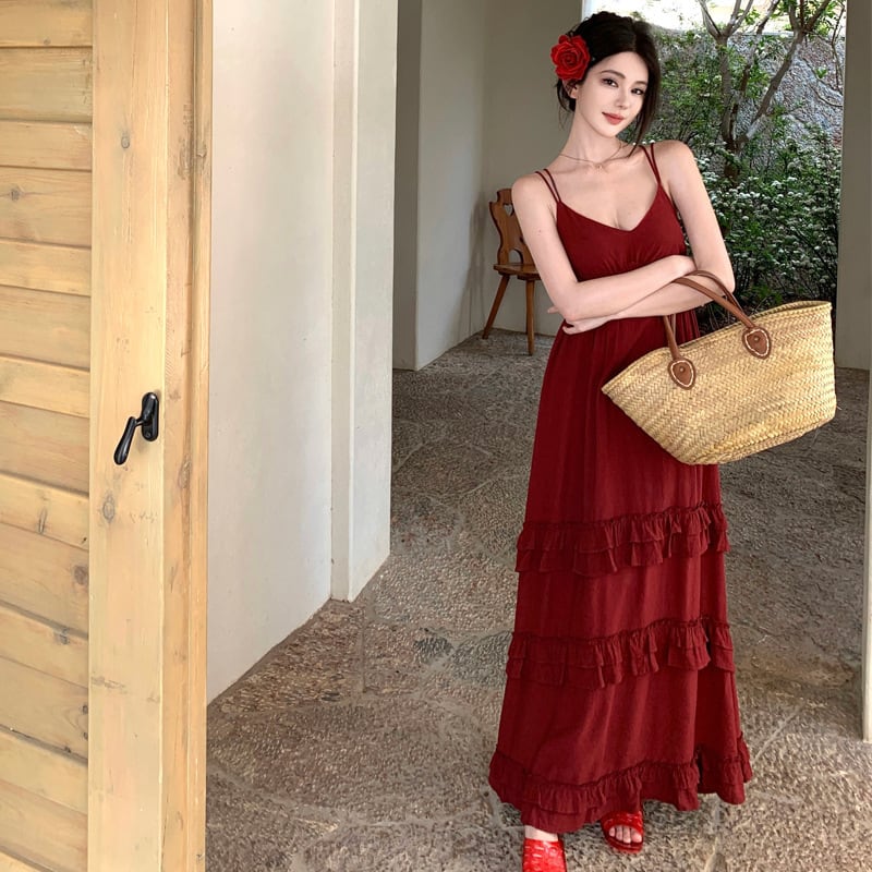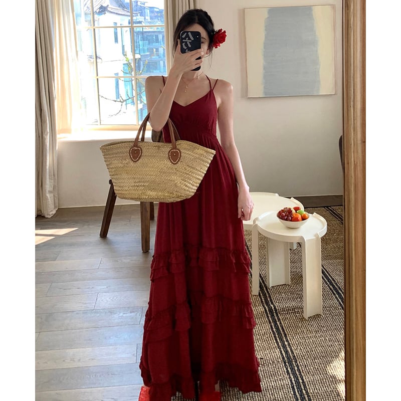 【SummerVacationシリーズ】吊りワンピース ペプラム 旅行 無地 レッド S M L