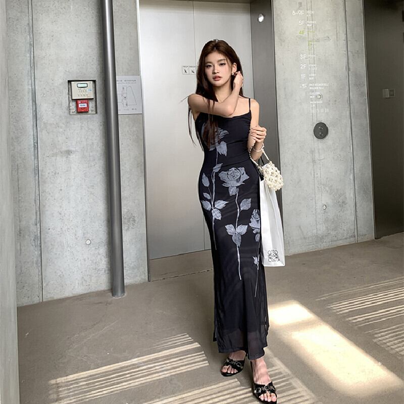 ワンピース ローズプリント フレンチ レトロ スリム ブラック S M L