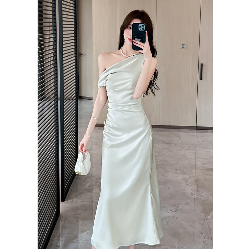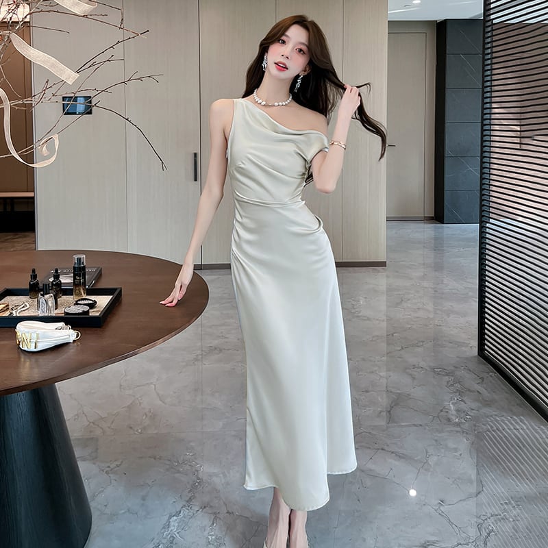 【CHERRYシリーズ】ワンピース 3色展開 ワンショルダー エレガント ピンク グレーグリーン ブラック S M L XL