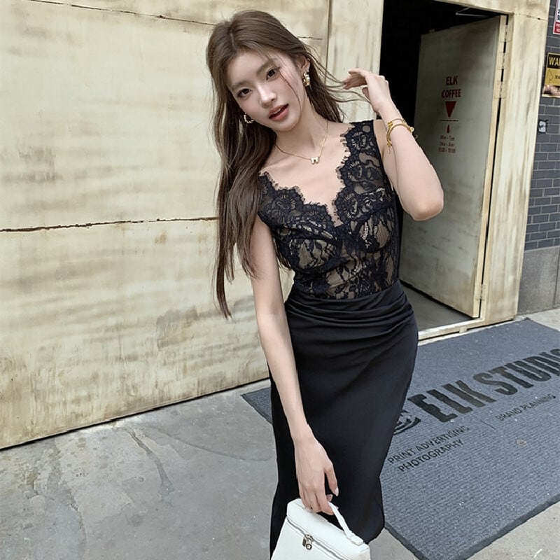 ワンピース レース バックスリット Vネック スリムフィット ブラック S M L