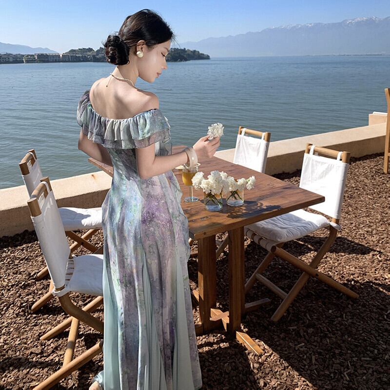 【SummerVacationシリーズ】ワンピース ボートネックデザイン リゾート風 配色 ペプラム S M L