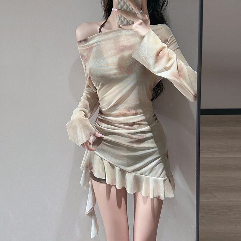 水着 3点セット 不規則 温泉 プリント コーヒー色 S M L