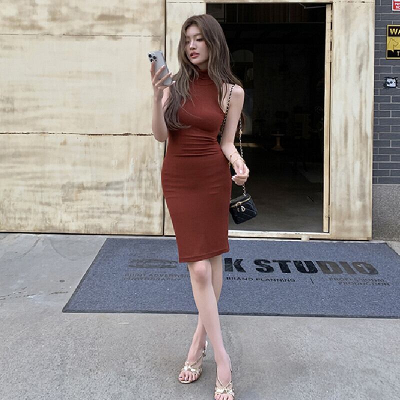 ワンピース ノースリーブ タートルネック ワインレッド S M L