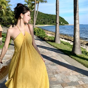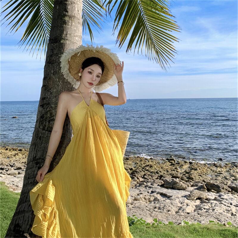 【SummerVacationシリーズ】ワンピース バックレス 無地 旅行 イエロー S M L