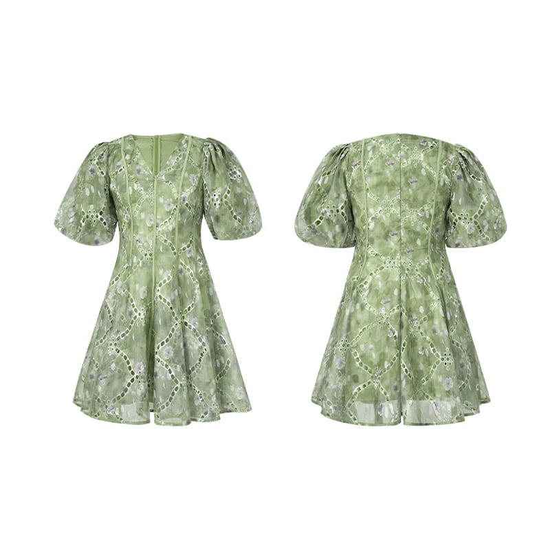 【夕暮薔薇シリーズ】ワンピース Vネック パフスリーブ Aライン グリーン S M L XL