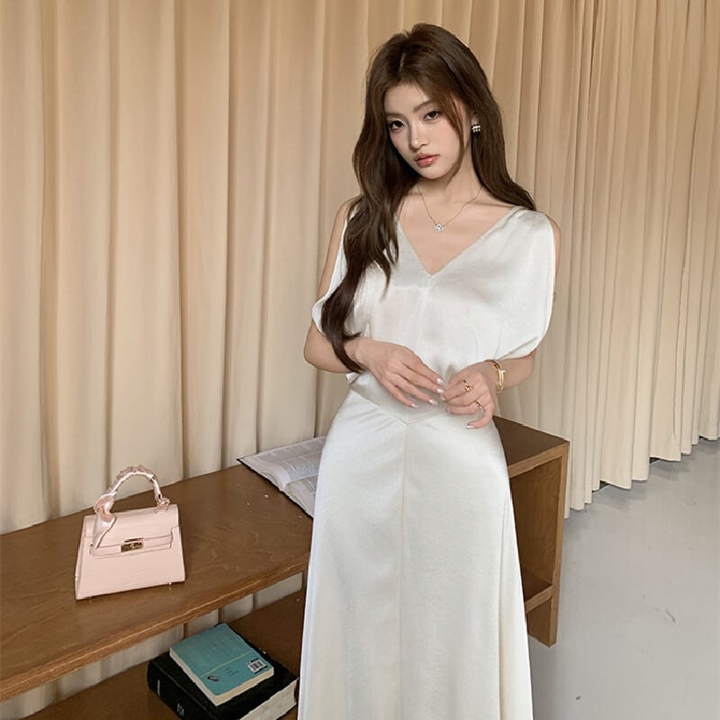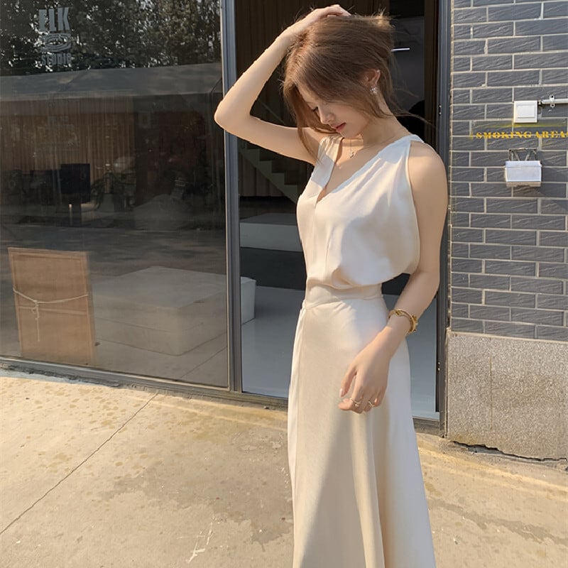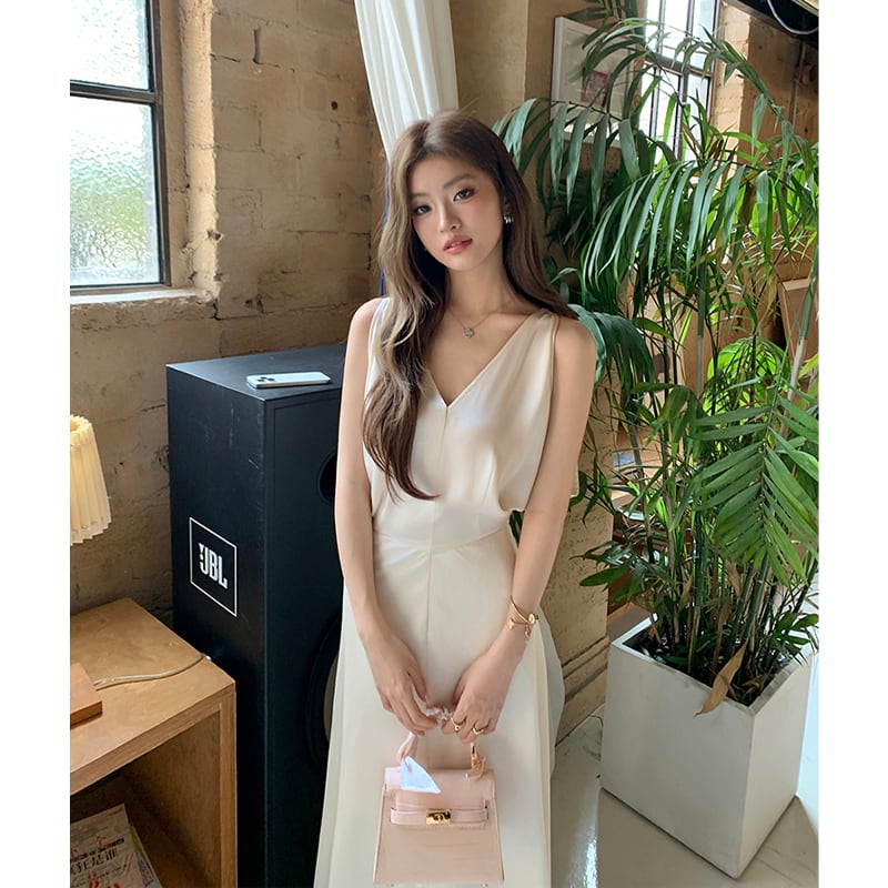 ワンピース Vネック 落ち感 無地 ロング丈 フェミニン ベージュ S M L