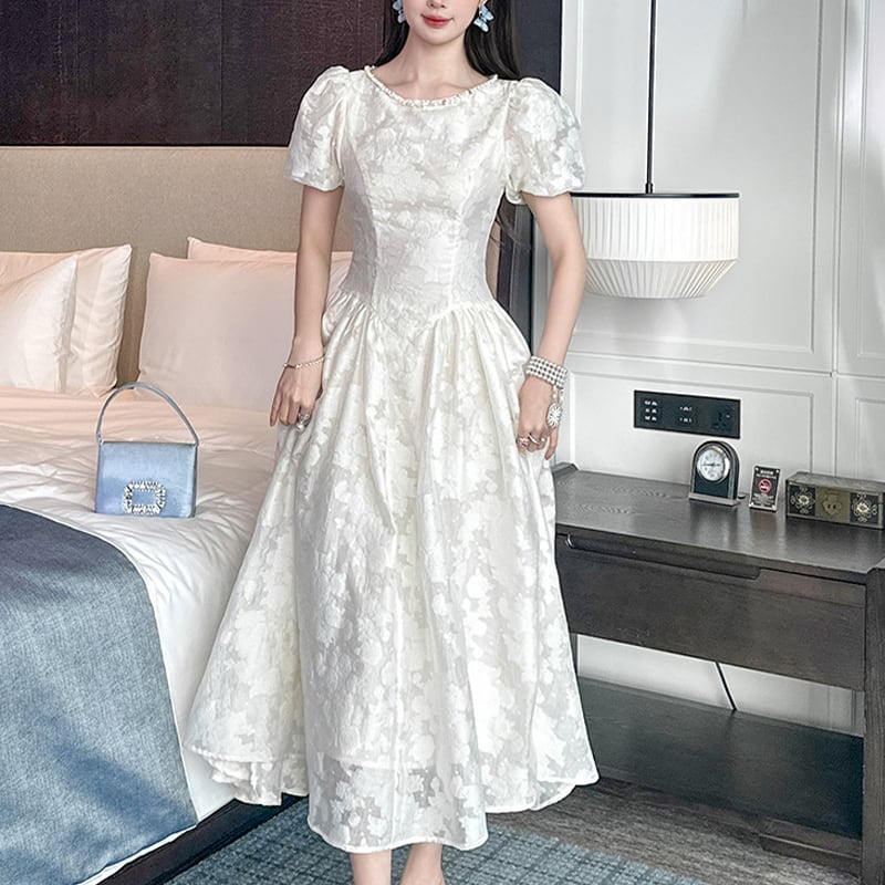 【夕暮薔薇シリーズ】ワンピース パフスリーブ ラウンドネック 大振裾 ベージュ S M L XL