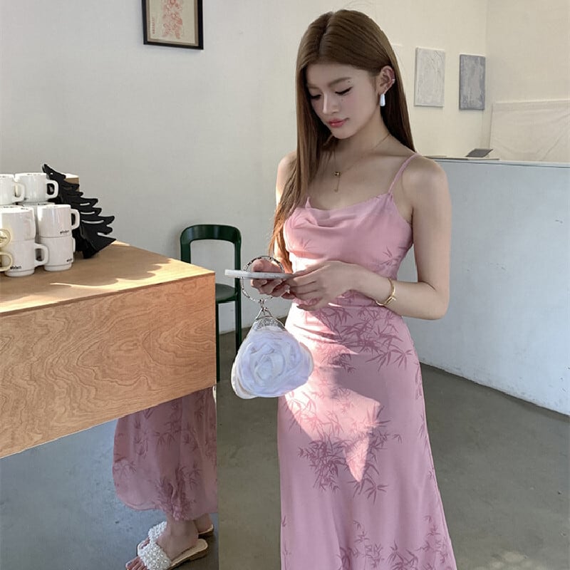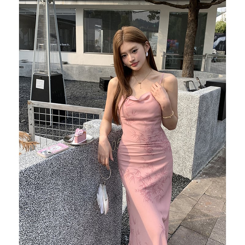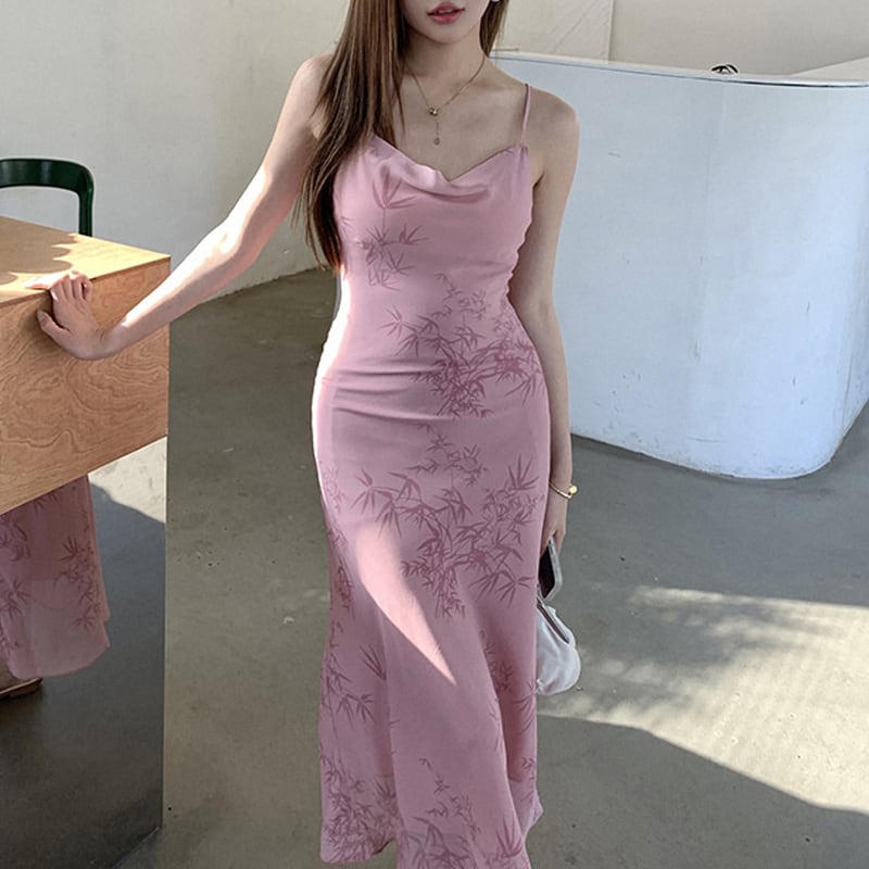 ワンピース ドレープネック プリント 一目惚れ おしゃれ ピンク S M L