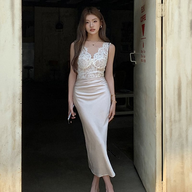 ワンピース レース Vネック フェミニン 気質溢れる ベージュ S M L