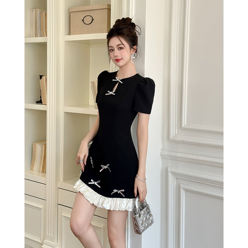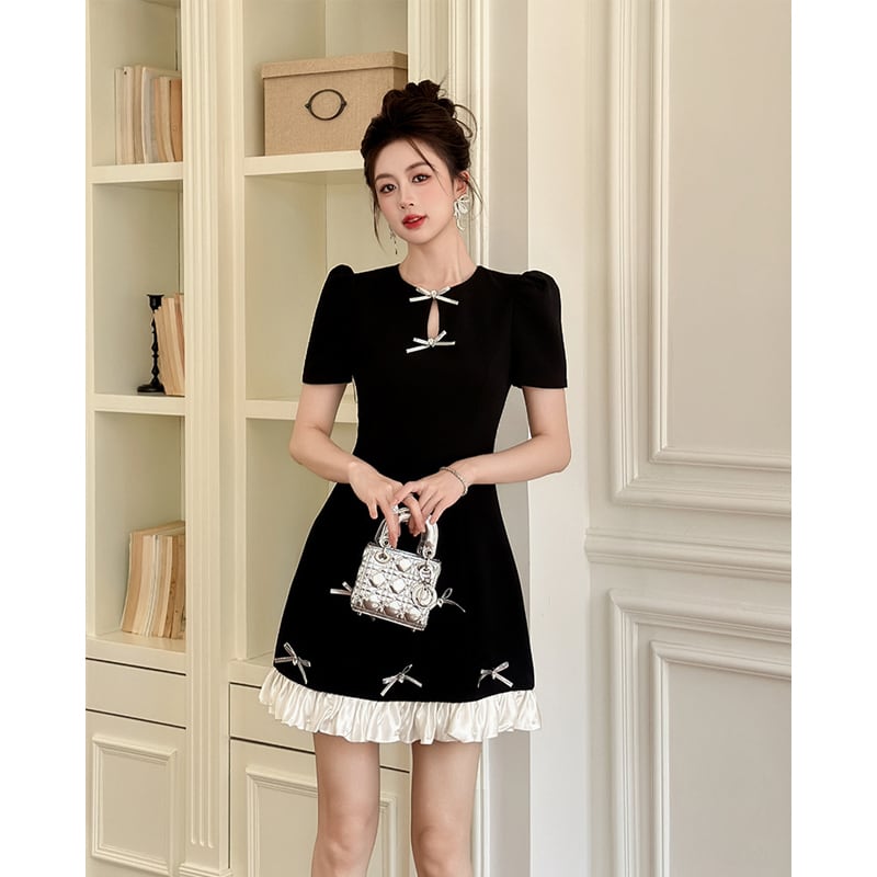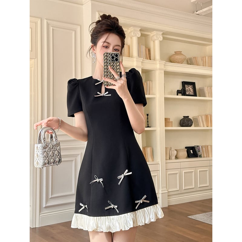 【夕暮薔薇シリーズ】ワンピース 気質アップ 肩パフ ハイウエスト ブラック S M L XL