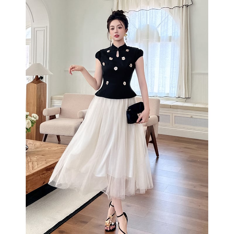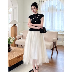 【夕暮薔薇シリーズ】ワンピース チャイナ風 フェイクレイヤード メッシュ S M L XL