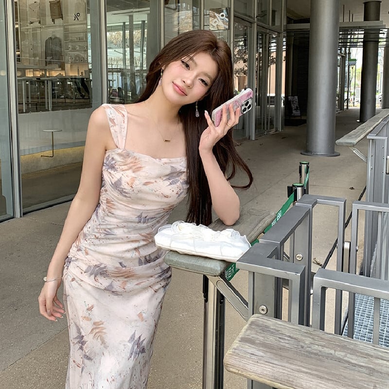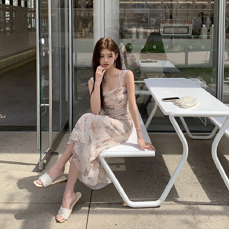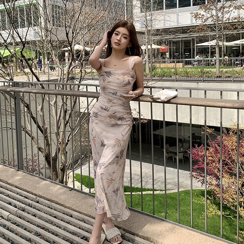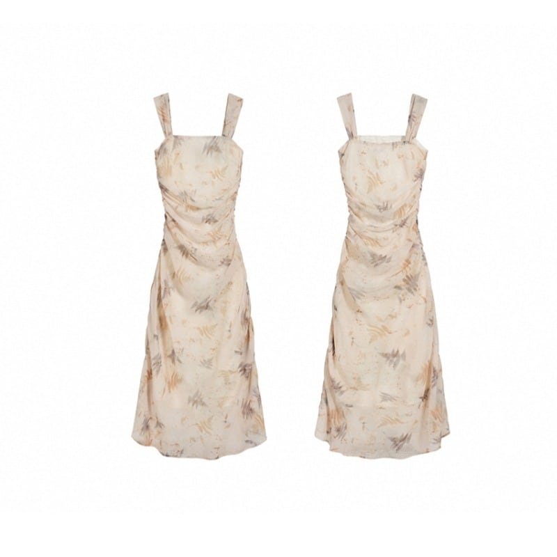 ワンピース スクエアネック ウエスト絞り プリント 一目惚れ S M L