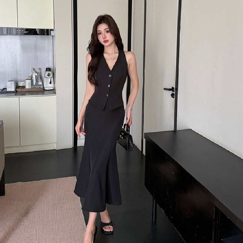 ワンピース Vネック フィッシュテール フェイクレイヤード ブラック S M L XL