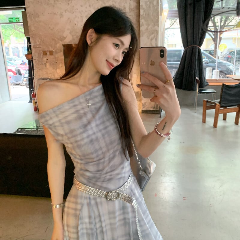 ワンピース オフショルダー チェック柄 ロング丈 ライトブルー S M L