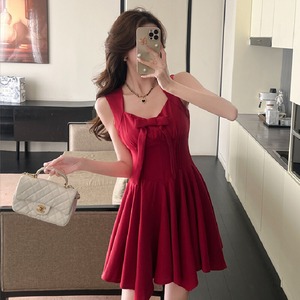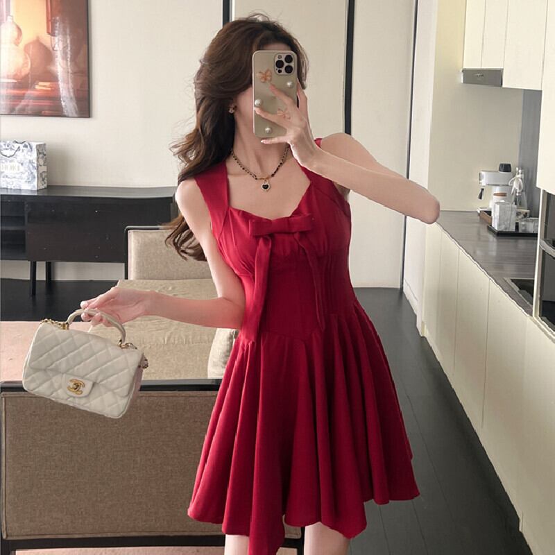 【CHERRYシリーズ】ワンピース スクエアネック 無地 Aライン レッド S M L