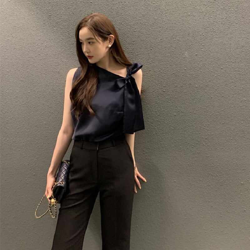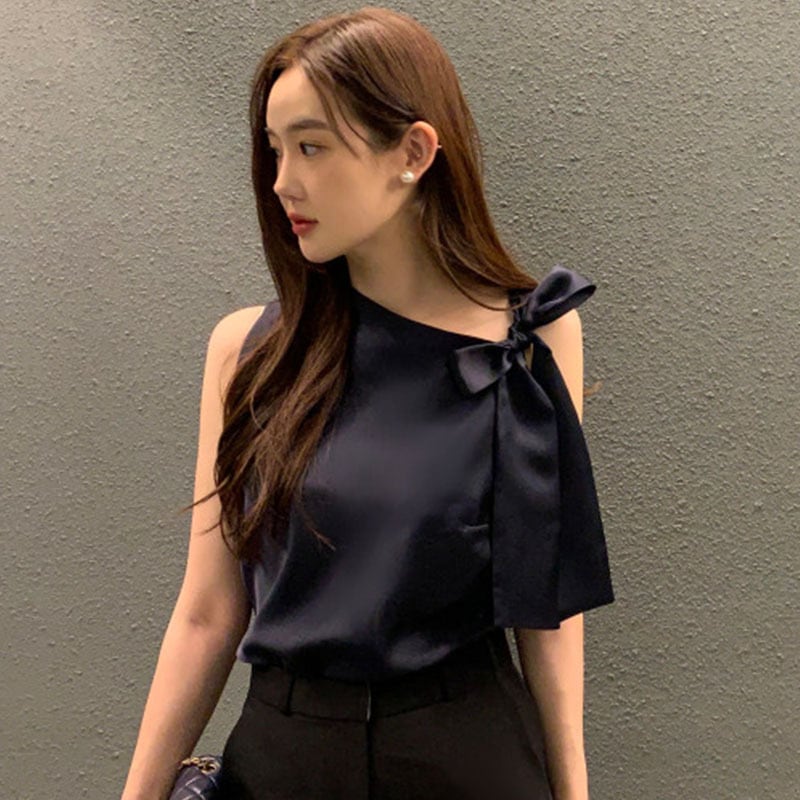 トップス シャツ 2色展開 ノースリーブ フェミニン リボン ダークブルー ベージュ