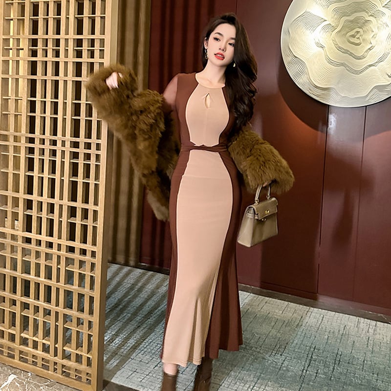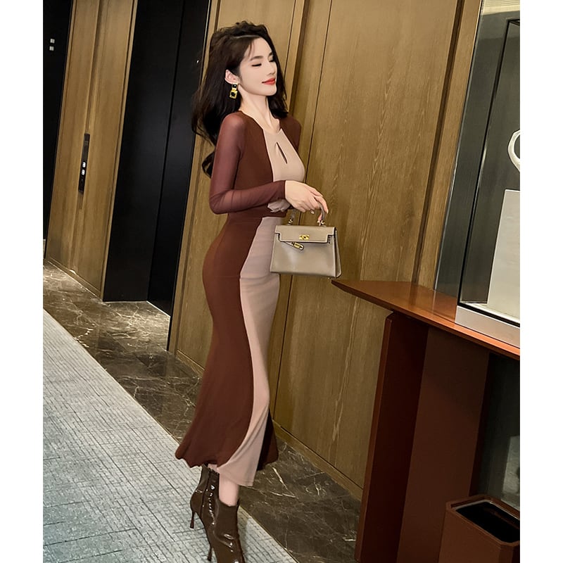 【夕暮薔薇シリーズ】ワンピース 配色 長袖 魅力的な姿になろう コーヒー色 S M L XL