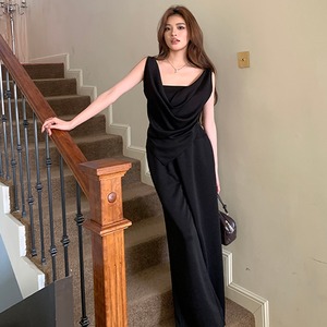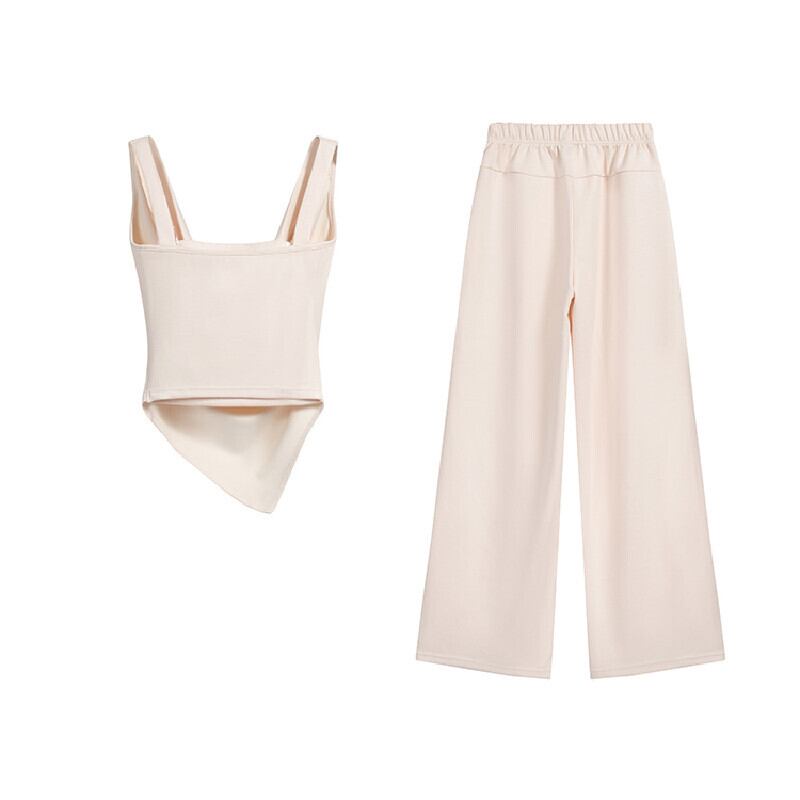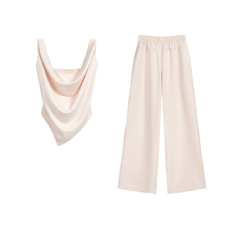 セットアップ タンクトップ+ワイドパンツ ゆったり ドレープネック ブラック アプリコット S M L