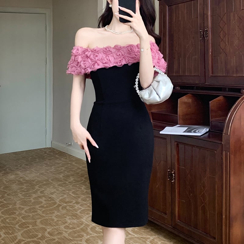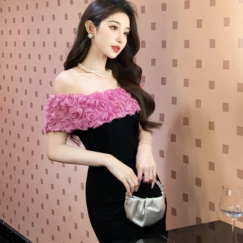 ワンピース ボートネックデザイン 立体花デザイン パーティー ブラック S M L XL