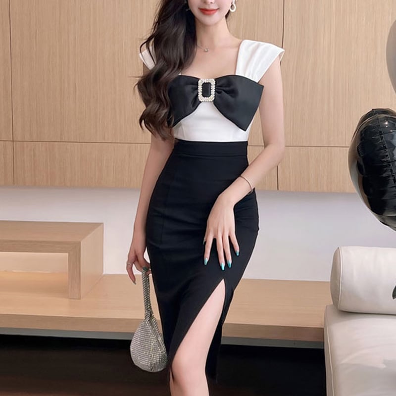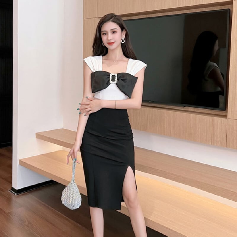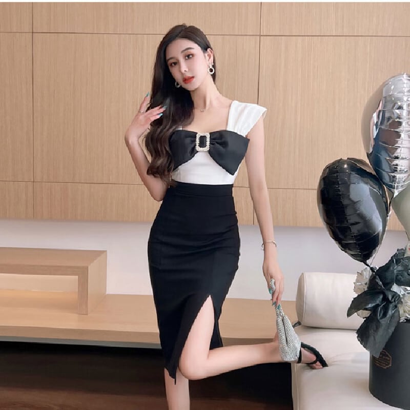 【QUEENシリーズ】ワンピース 配色 パーティー スリット ブラック+ホワイト S M L XL