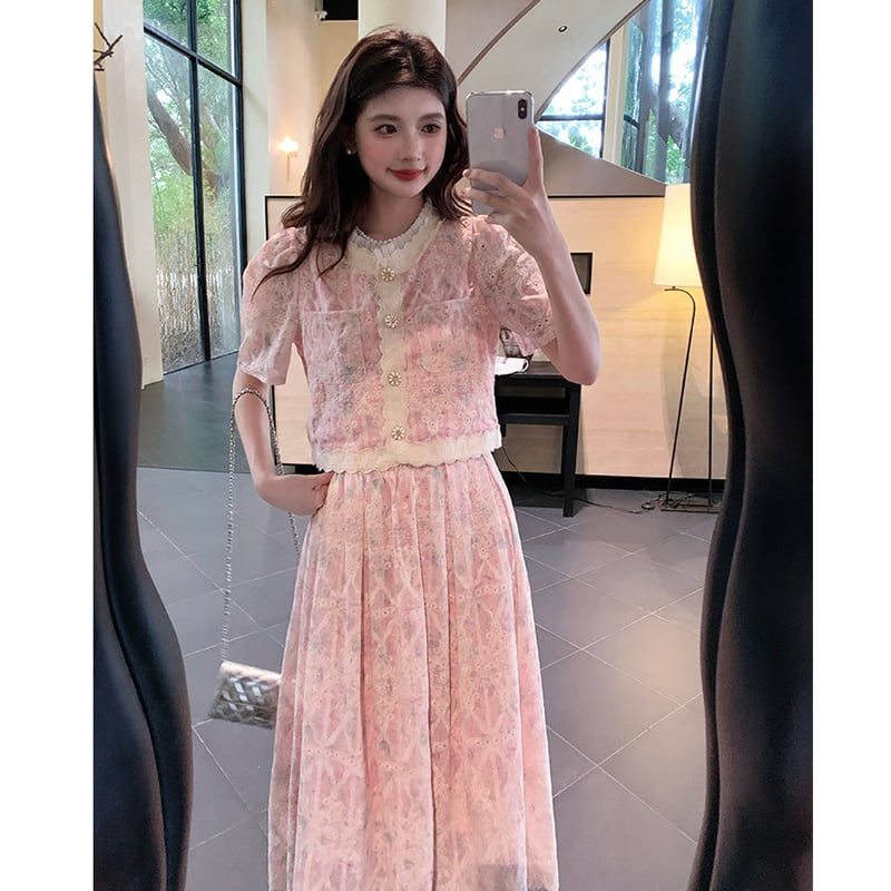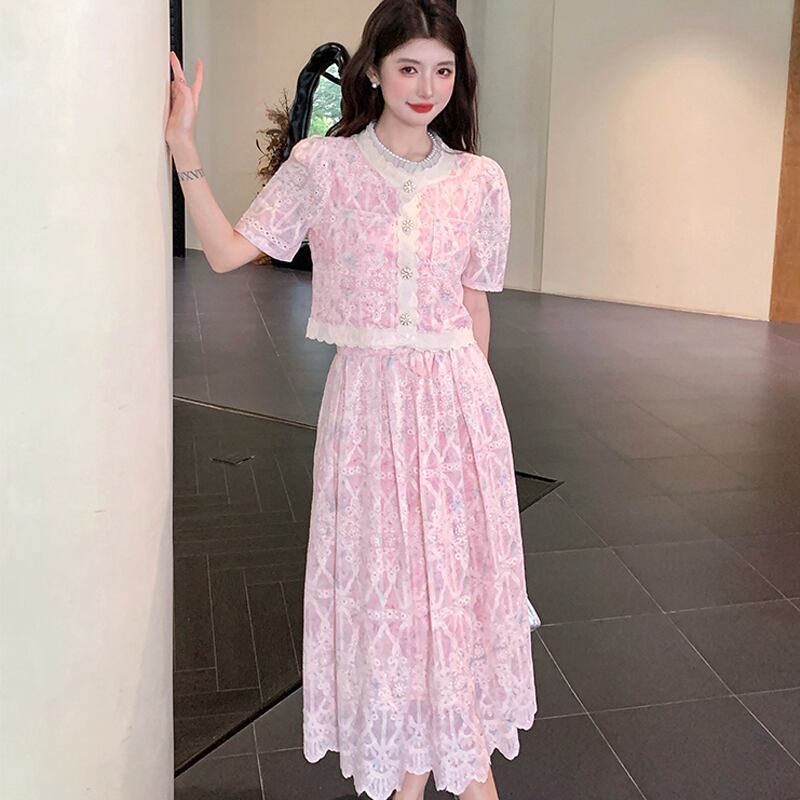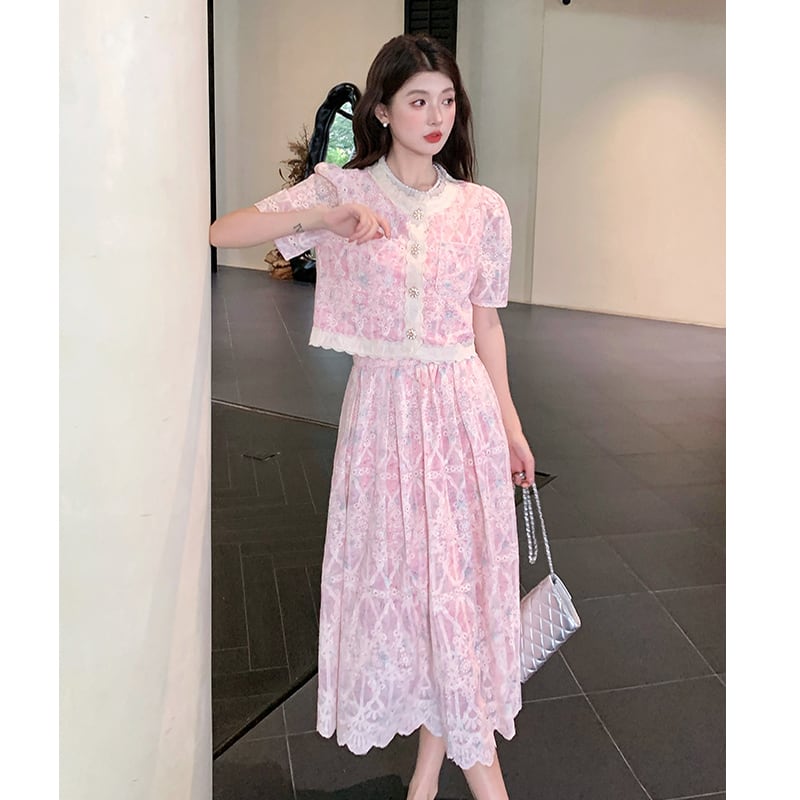 セットアップ トップス+スカート 刺繡 美人度アップ スウィート ピンク S M L XL 2XL