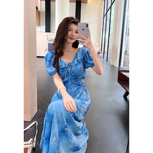 ワンピース 花柄 ペプラム リボン 刺繡 カジュアル ブルー S M L XL 2XL