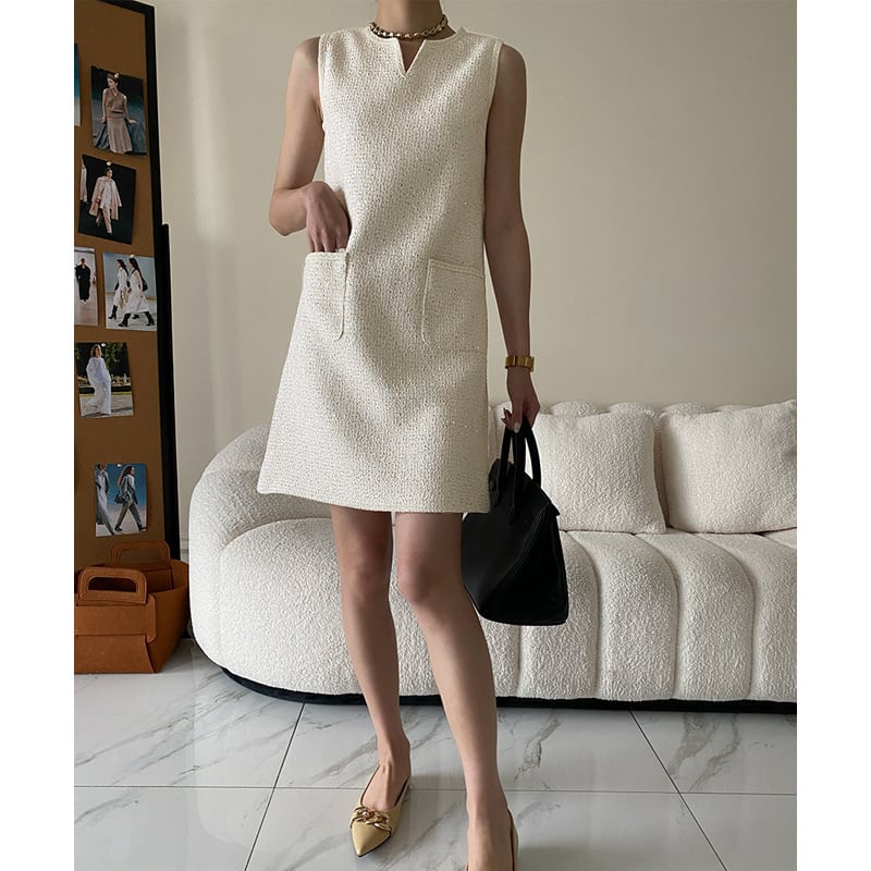 ワンピース ノースリーブ フェミニン ツイード スパンコール ベージュ S M L XL