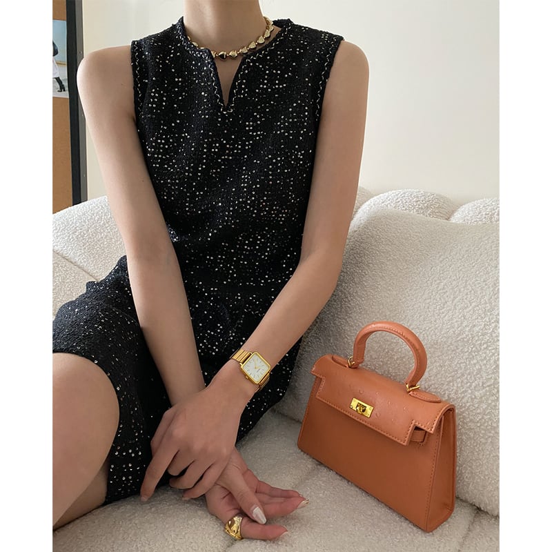 ワンピース ノースリーブ ツイード 膝上 スパンコール ブラック S M L XL