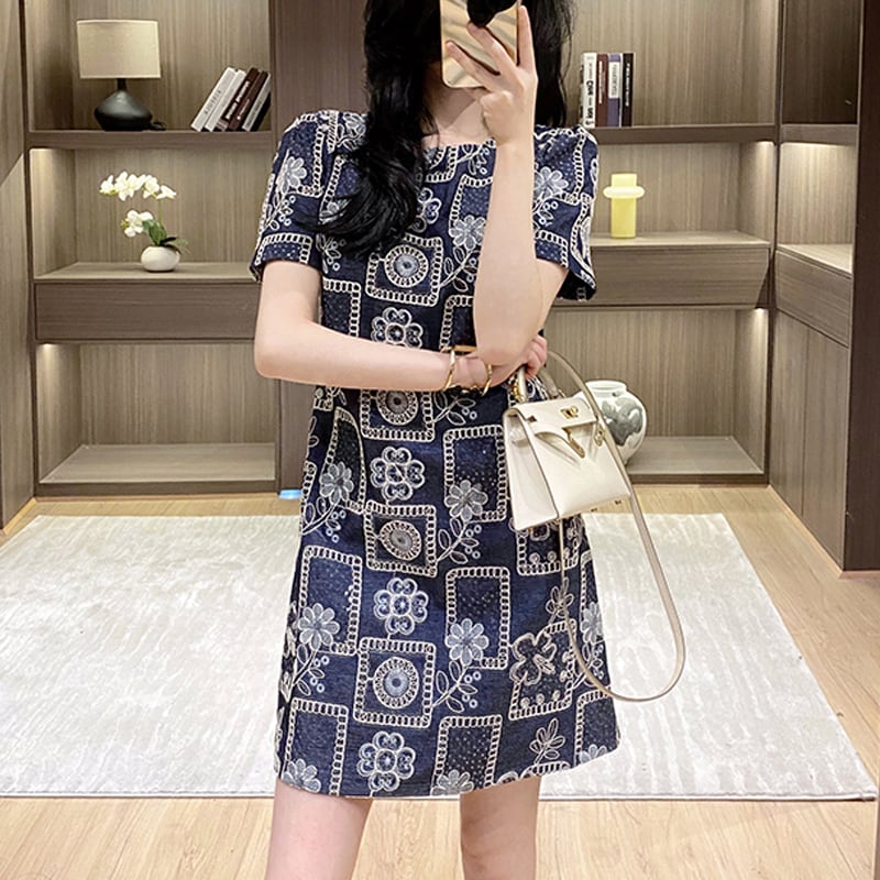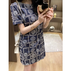 【RIMIシリーズ】ワンピース 刺繡 デニム 半袖 ダークブルー S M L XL 2XL