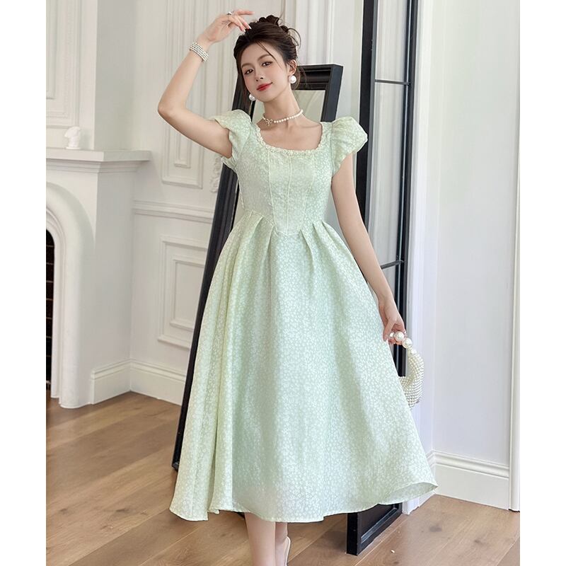 【夕暮薔薇シリーズ】ワンピース 花柄 パフスリーブ 清新 グリーン S M L XL