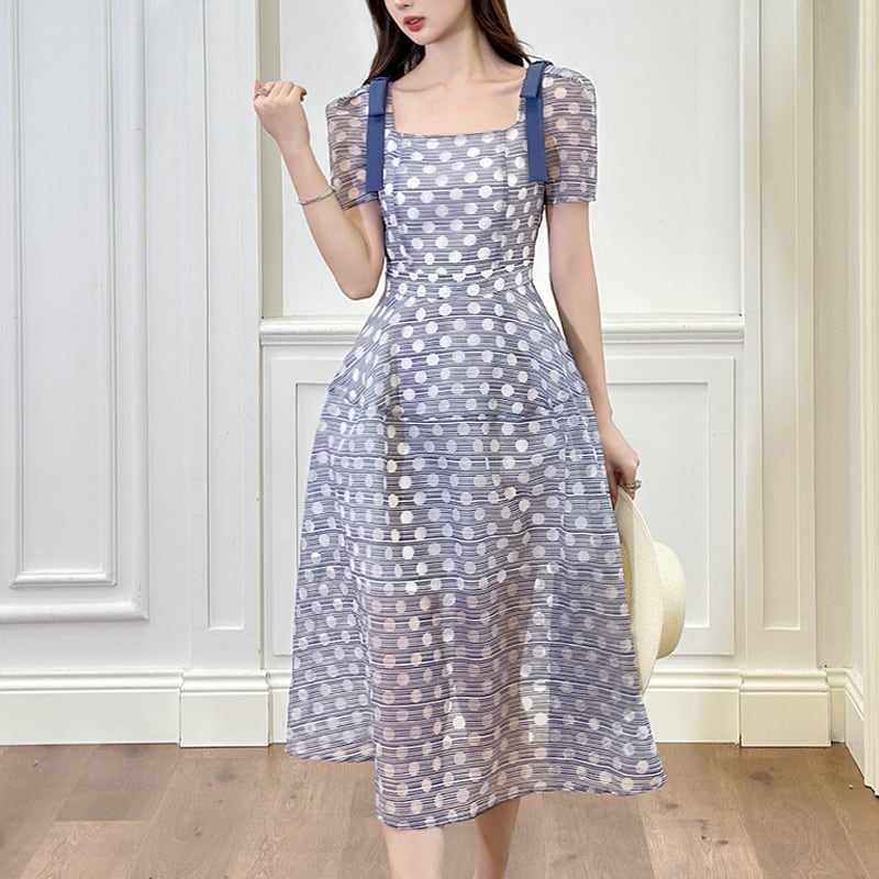【夕暮薔薇シリーズ】ワンピース レトロ スクエアネック ドット柄 気質溢れる M L XL