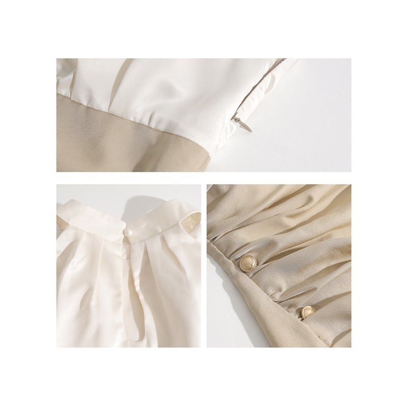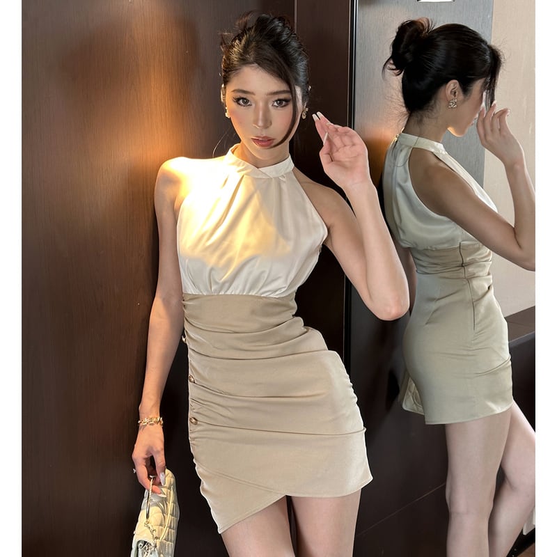 ワンピース ノースリーブ 目を奪われる ウエスト絞りデザイン 配色 S M L