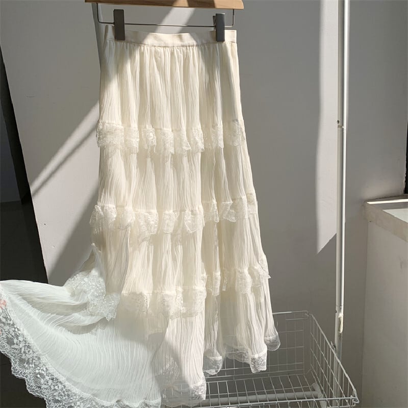 ボトムス スカート ウエストゴム レース 気質溢れる ロング丈 ベージュ
