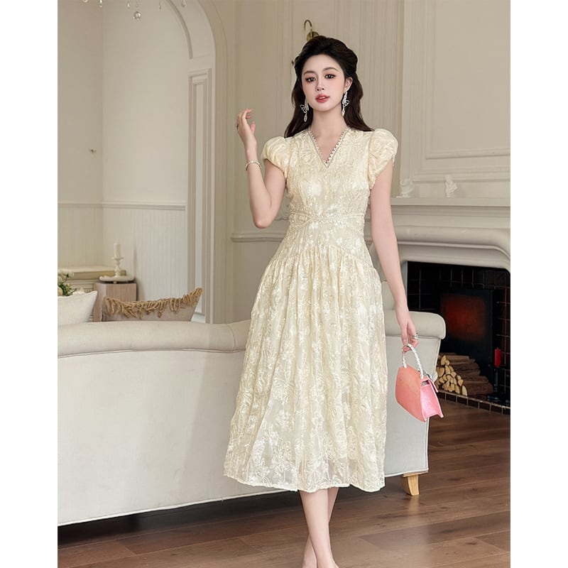 【夕暮薔薇シリーズ】ワンピース パフスリーブ 気質溢れる スパンコール ベージュ S M L XL