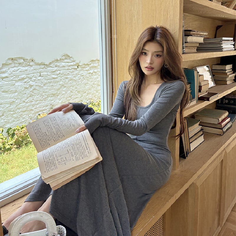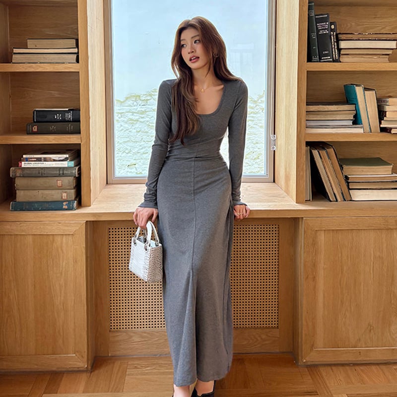 ✿2025秋新作✿ロングワンピース 無地 カジュアル 長袖 グレー S M L