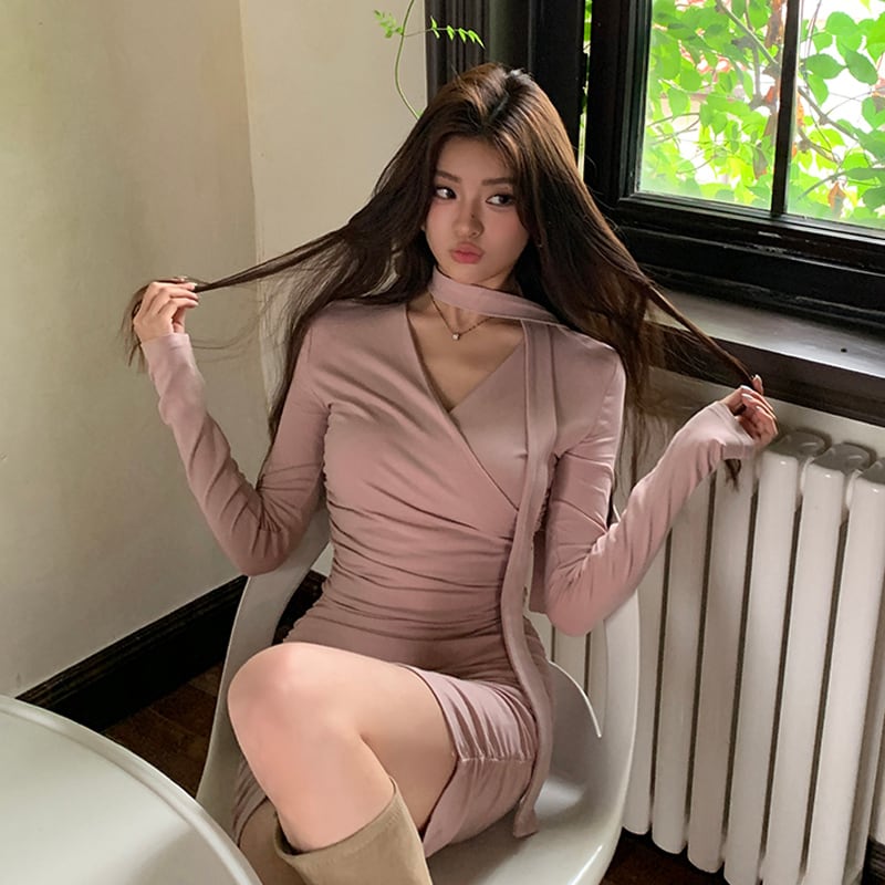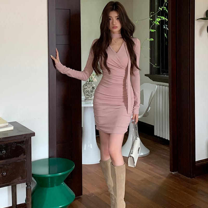 ✿2025秋新作✿ワンピース Vネック 美人度アップ 膝上 長袖 ピンク S M L