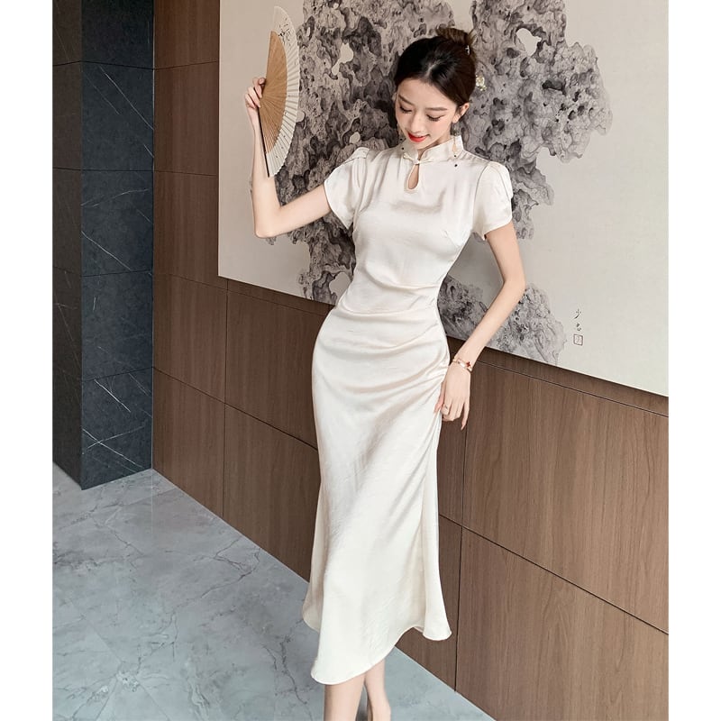 【CHERRYシリーズ】ワンピース チャイナ風 無地 レトロ ベージュ S M L