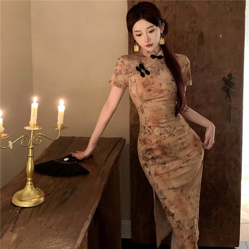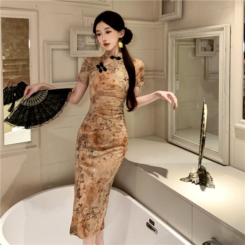ワンピース チャイナ風 プリント 半袖 ウエスト絞り 気質溢れる S M L