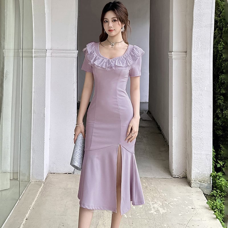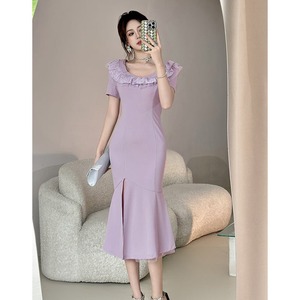 【夕暮薔薇シリーズ】ワンピース ペプラム スリット フィッシュテール パープル S M L XL