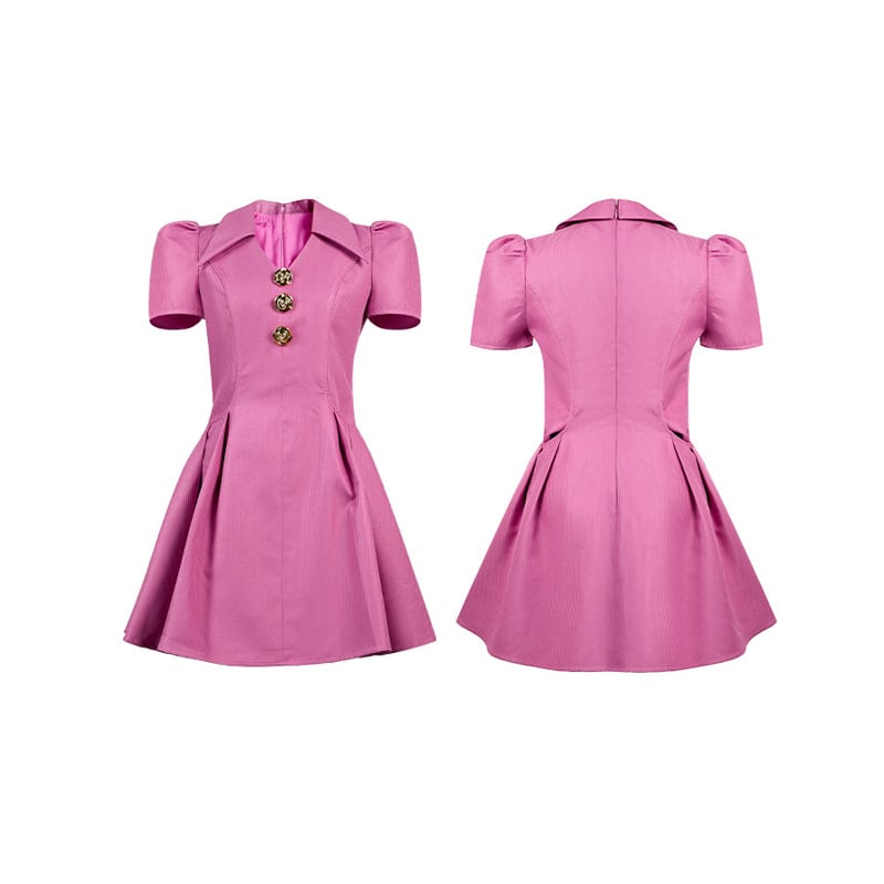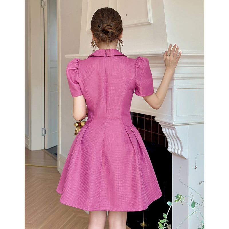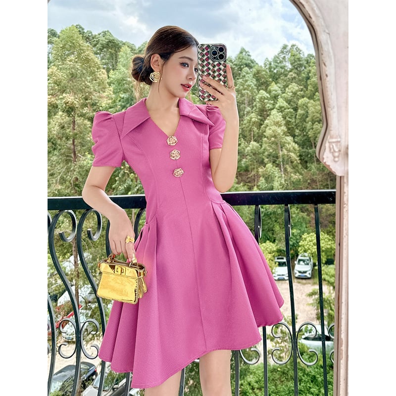 【夕暮薔薇シリーズ】ワンピース 折り襟デザイン Aライン ローズ色 S M L XL