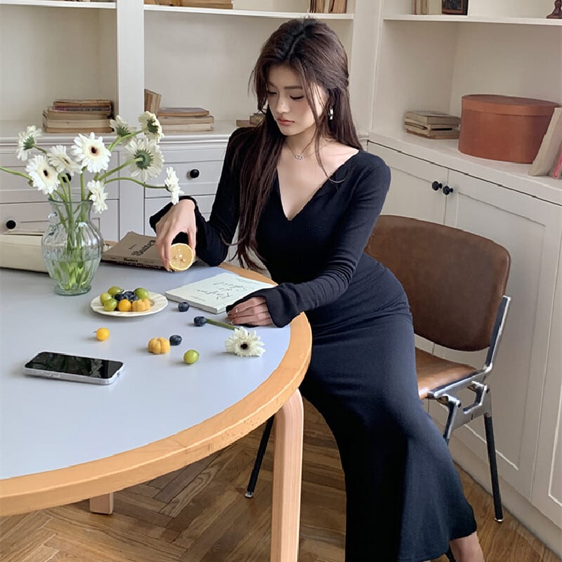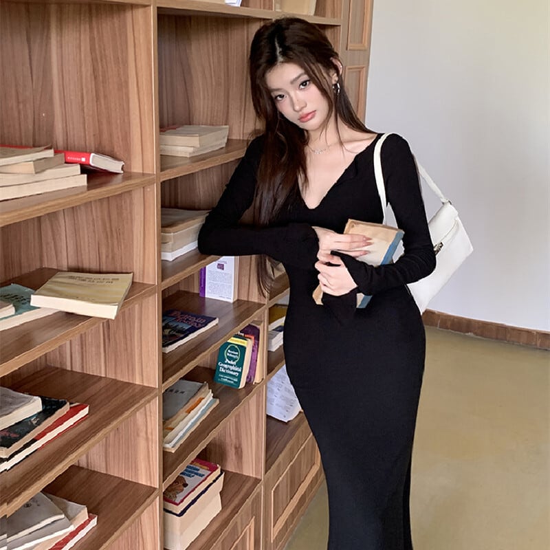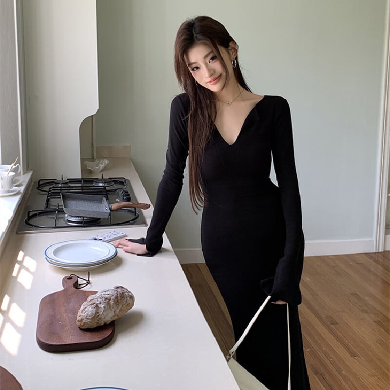 ✿2025秋新作✿ワンピース Vネック 長袖 スリミング ブラック S M L